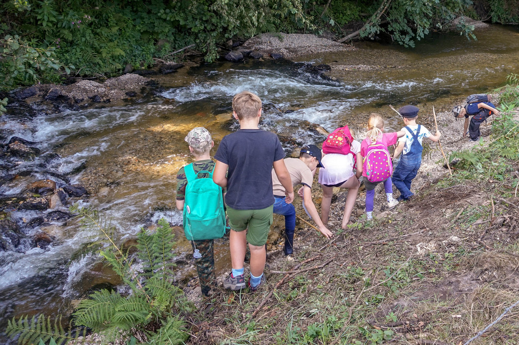 Mit Keschern und Watstiefeln ging es ins Wasser, um kleine ‚Krabbeltierchen‘ zu fangen. „Die dienen zur Bestimmung der Wasserqualität. Bestimmte Tierchen sind der Indikator für eine hohe Wasserqualität und die versuchen wir zu fangen und zu bestimmen“, erklärte Ralf Siemer den Kindern. Und das Engagement der jungen Naturschützer zahlte sich aus. Großlibellen-, Eintags- und Köcherfliegenlarven, Bachflohkrebse, einige Stichlinge und sogar eine Mühlkoppe (FFH-Art) landeten im Eimer. Der Naturschutznachwuchs lauschte interessiert den Erklärungen Ralf Siemers. „Die Großlibellenlarve lebt einige Jahre im Gewässer und ist ein großer Räuber, sie ernährt sich sogar von kleinen Fischen. Köcherfliegenlarven bauen sich zum Schutz vor Fressfeinden aus kleinen Pflanzenteilen und Steinen eine Röhre (Köcher) in der sie leben. Der Stichling legt seine Eier in selbstgebaute Nester und die Mühlkoppe in eine Höhle. Anschließend betreiben die Männchen Brutpflege und bewachen die Eier bis zum Schlupf der Jungen.“ Alle gefangenen ‚Krabbeltierchen‘ kommen nur in sehr gutem Wasser vor, deshalb zählt die Aue zu einem der besten Fließgewässer im Landkreis. Die Tierchen wurden anschließend wieder schonend zurückgesetzt.