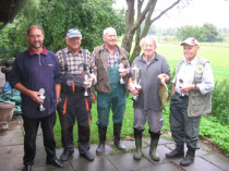 An der Waage konnte Erhard Zimmermann den schwersten Fisch, eine Brasse von fast einem Kilo, zeigen. Weitere erfolgreiche Fänger waren (Foto v. l.) Heiko Bitter, Edwin Hinrichsen, Manfred Keller und rechts Heinz Hess. Mit viel Anglerlatein ließen alle Teilnehmer am Grill den Angelvormittag ausklingen.